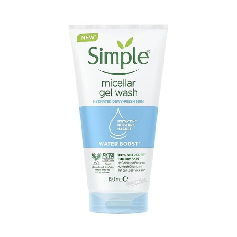 - Simple Water Boost Micellar Facial Gel Wash contains no harsh chemicals, artificial colors or perfume, making it perfectly suitable for dehydrated, dry or sensitive skin