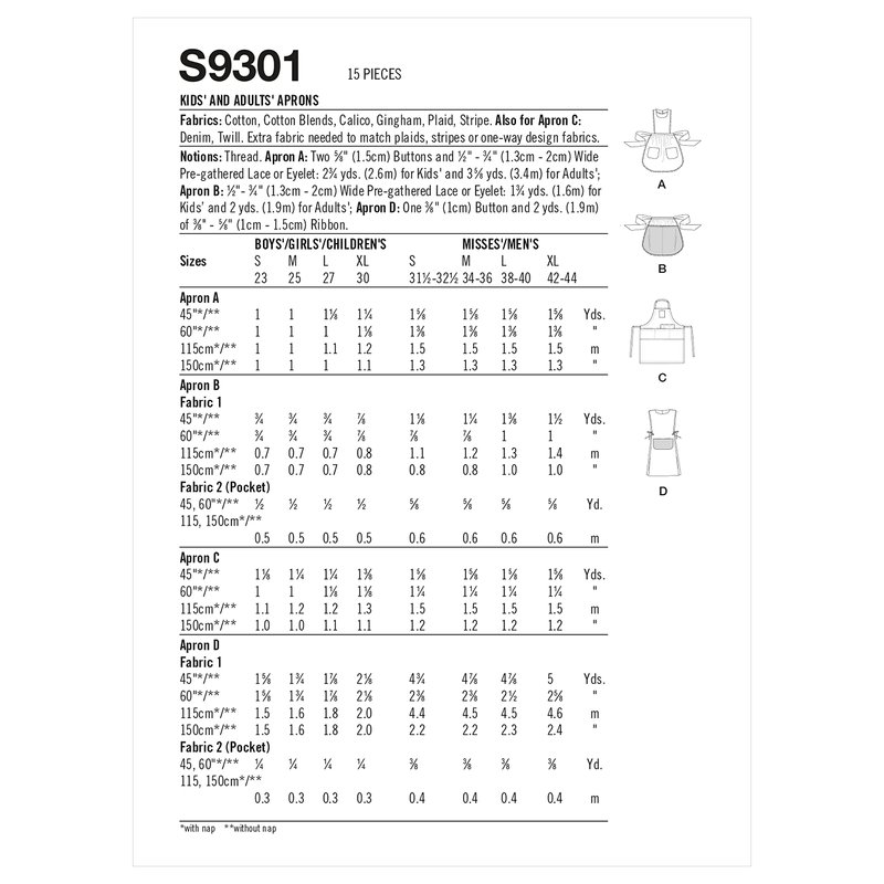 Simplicity Kids' and Adult's Half and Full Apron Packet, Code 9301 Sewing Pattern, Sizes S-XL, White