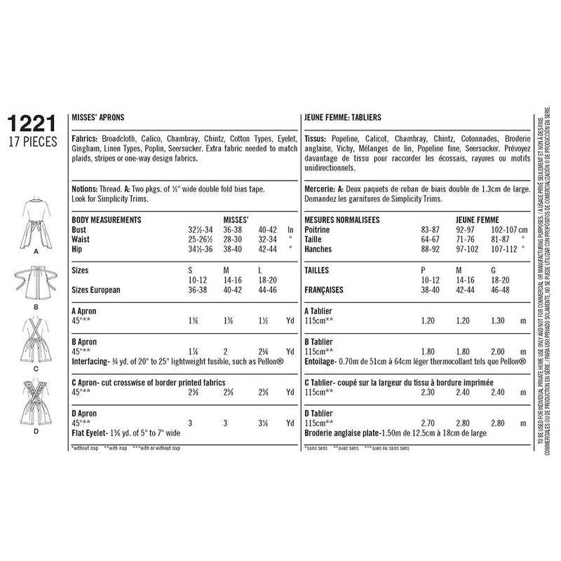- Women's sewing pattern packet includes sewing templates, pattern pieces, fabric recommendations, sizing guides, and instructions for (4) different aprons.