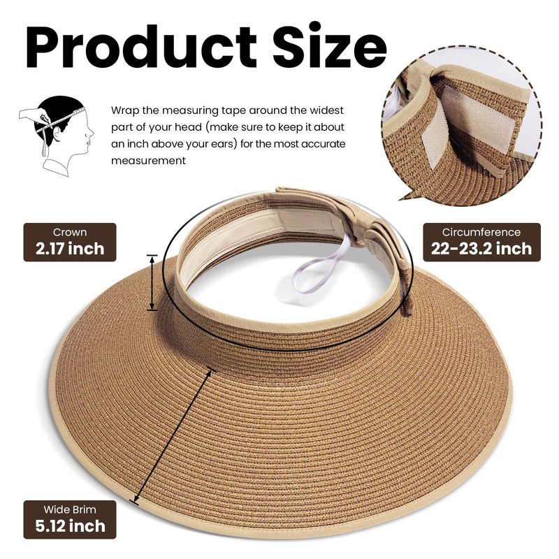 - Adjustable Summer Hat: Adjustable head circumference about 22"-23.2" to fit your head size; It is also suitable to wear even with various hair styles. With this topless ponytail straw sun visor, it is easy to throw your hair in a messy bun or ponytail, no more muss of your hairdo