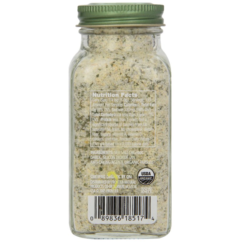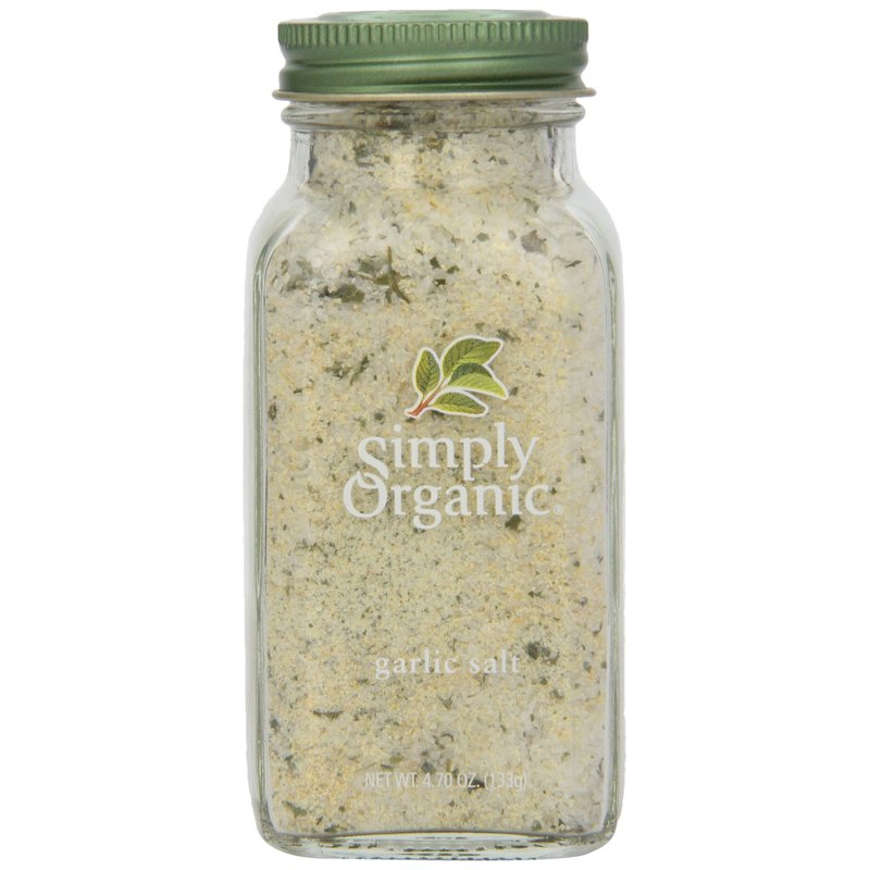 - GARLIC SALT - Simply Organic is serious about flavor. This is real.garlic.salt. No GMOs. No ETO (considered carcinogenic by the EPA). Not irradiated. Certified Organic by QAI. Kosher Certified by KSA. Made with real Allium sativa for pure, potent, true garlic flavor and aroma‚ with sea salt and a touch of parsley. Get some, and make all your dishes pop.