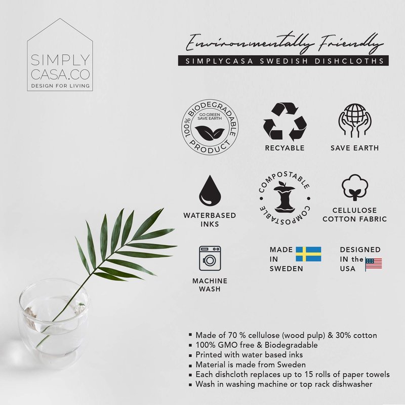 - Eco-friendly kitchen cloth by SIMPLYCASA is made of 70 % cellulose (wood pulp) & 30% cotton, printed with water based inks. 100% Biodegradable. Made in Sweden. Long size: 6 by 10 inches.