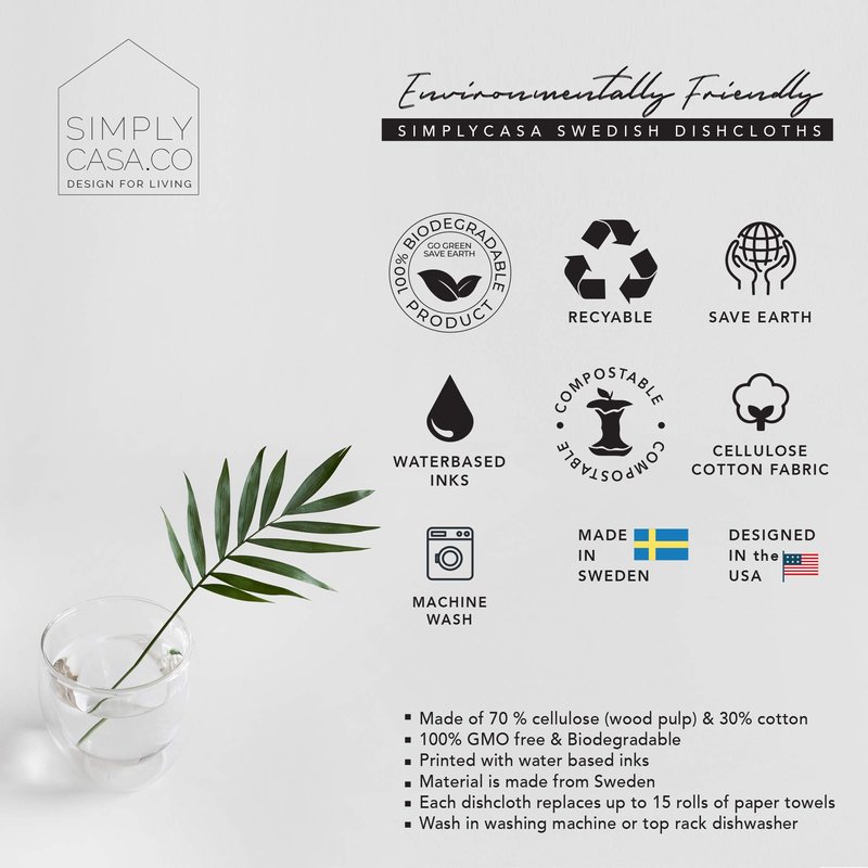 - Eco-friendly kitchen cloth by SIMPLYCASA is made of 70 % cellulose (wood pulp) & 30% cotton, printed with water based inks. 100% Biodegradable. Material made from Sweden. Size: 6 by 7 inches.