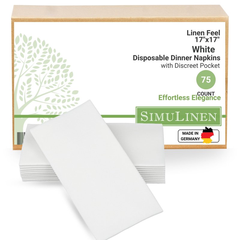 SimuLinen – White – Disposable Dinner Napkins with Discreet Pocket for Utensils - Decorative, Absorbent, Paper Napkins perfect for Silverware, size 17”x17” – Box of 75