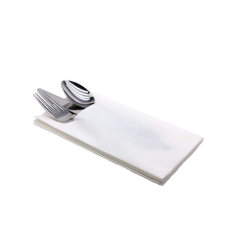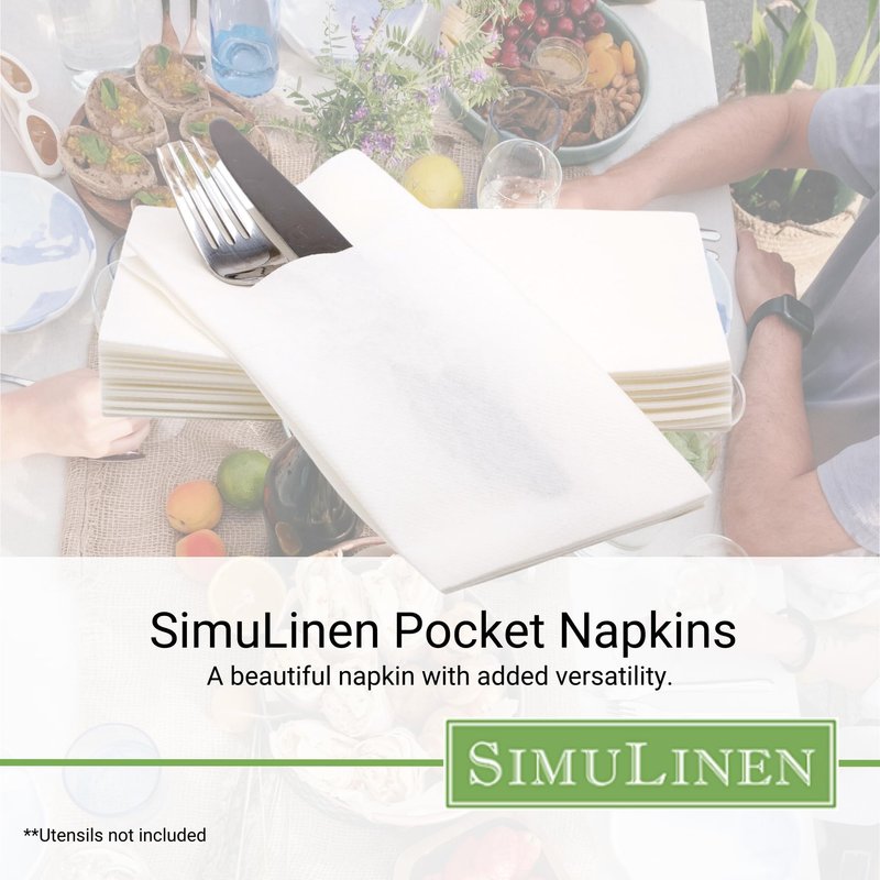 SimuLinen is proud to offer our Pocket Napkins for silverware. These are disposable paper napkins that are cloth like and have a linen feel. They are a decorative White. Unlike others, our pocket is discreet and doesn’t have to hold silverware or anything else – your guests won’t ever notice the pocket if you don’t want them to. However, they are perfect for holding utensils. Our products are all very absorbent and durable. Your guests will be impressed with the quality.