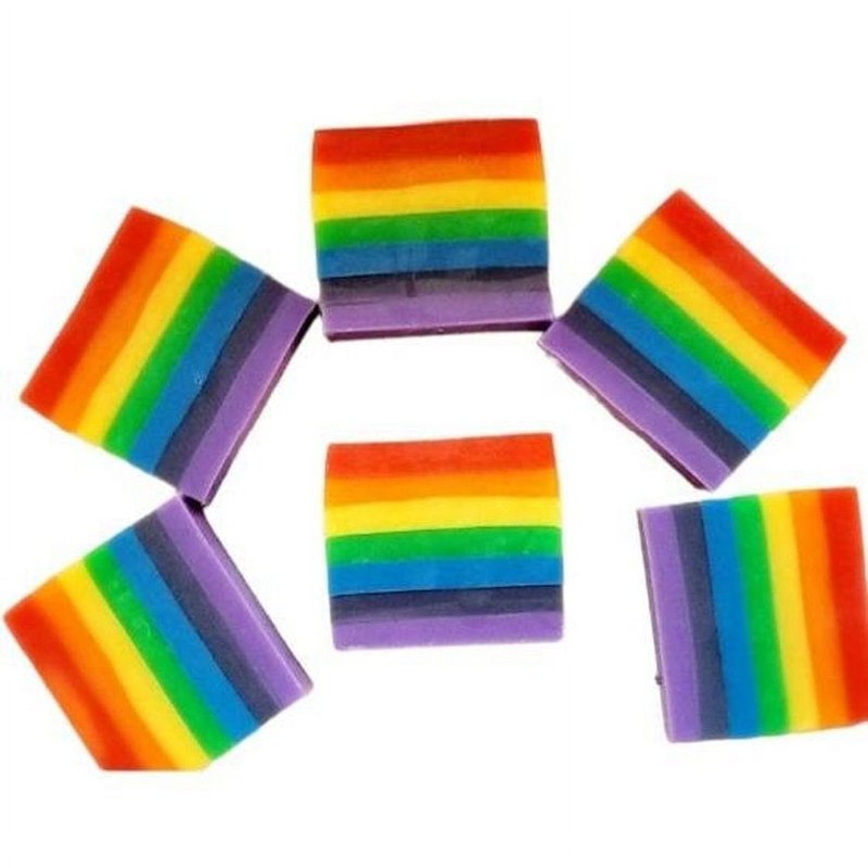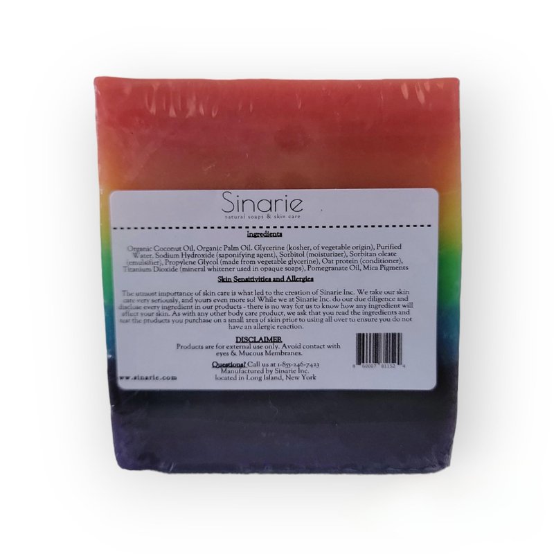 Rainbow Soap | Palm Free Soap | Rainbow Bar Soap | Colorful Soap | Rainbow | Pride Soap | LGBTQ Gift | Pride Bar Soap | Gifts For Him | Gifts for Her Did someone say rainbows?! This super pretty rainbow soap bar is handcrafted with natural, cocoa butter, pomegranate oil, essential oils, and mica powder pigments. Smells like: sweet & indulgent, earthy and free-sprited Sinarie Inc.'s Sweet Rainbow Bar is made with pomegranate oil, and essential oils/fragrances. The scent notes in this bar give you those wild and free vibes while keeping your skin nourished and soothed! Type: Sweet Rainbows Bar Size: 5 oz. -Vegan -Essential Oil Scented -Free of Parabens, SLS, Sulfates -Naturally Colored -Organic -Palm free or sustainable Palm Oils only!