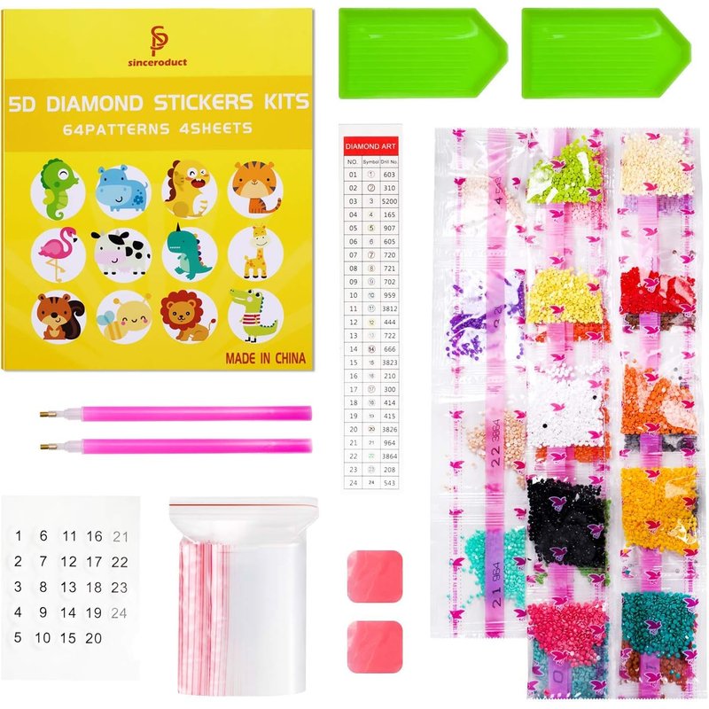 Sinceroduct 64 PCS 5D DIY Diamond Paint Sticker Set is a fun educational toy that can improve children’s IQ and EQ. It is very suitable for children over 6 years old, and can develop their practical, color recognition, character recognition and hand–eye coordination abilities. In the creation process, the participation of parents can promote the child’s concentration and the parent–child relationship. After finishing the work, you can paste it on any clean surface as a decoration, refrigerator doors, books, telephones, pen cases, plates, glasses, suitcases, hats,etc. And you can freely match it to give full play to your imagination and experience a sense of DIY achievement. Before making large diamond for adults, it can also be used as hands-on work.