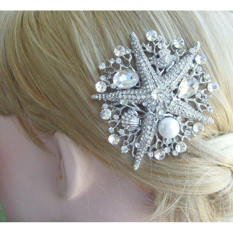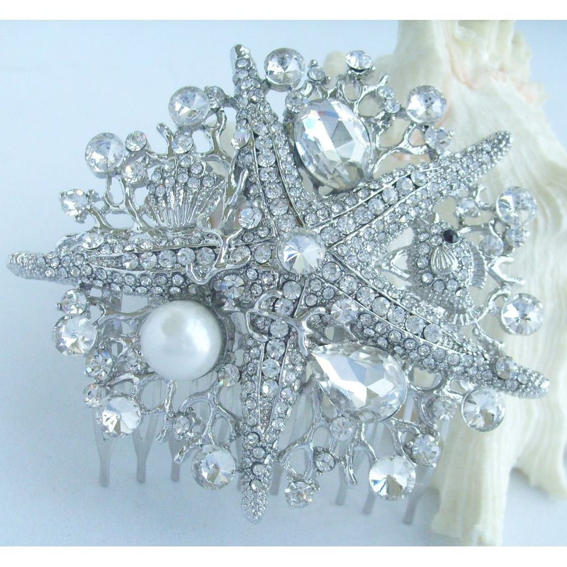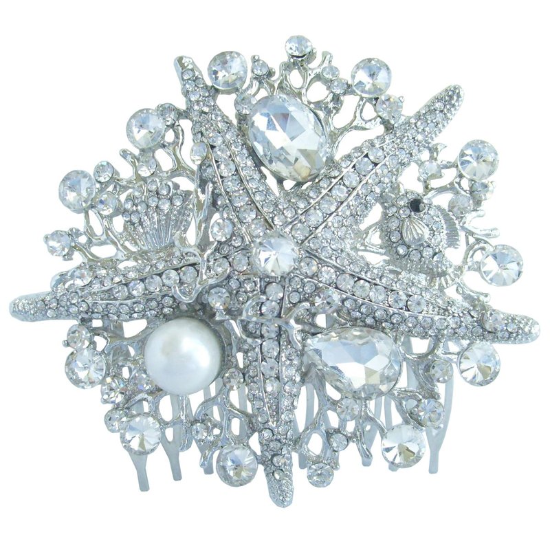 Sindary Wedding Headpiece 3.15" Pearl Rhinestone Crystal Bridal Starfish Hair Comb HZ6412 (Silver-Tone Clear)