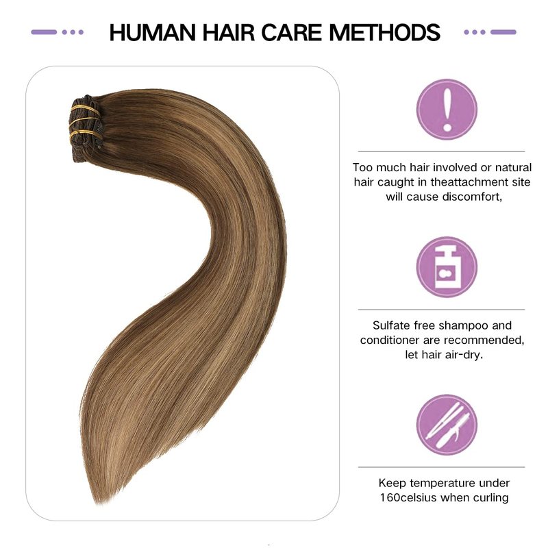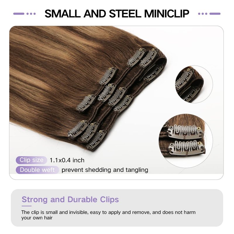 - [Natural & Pretty Looking] Clip in extensions real human hair blend well with your own hair. Besides, this real hair can be restyled, permed. Meet what you want to have a layered look or a gorgeous hairstyle, show your natural looking
