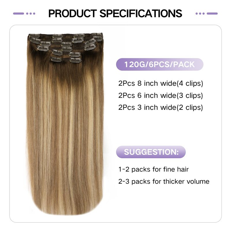 - Clip in Hair Extensions Specification-- Each clip in hair extensions comes with 6pcs of sewn on to ultra soft weft for maximum comfort and wearability 14-16 inch is 100g/pack 18 20 22 inch is 120g/pack More flexible to use, you can take only few pieces to change local effect or you can wear all clip ins to get fuller and longer hair looking