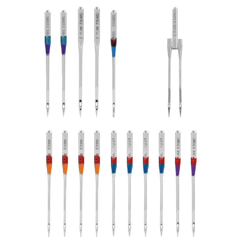- Bulk sewing needle set includes: (10) universal regular point needles in size 80/12, 90/14, 100/16 for use on various denim weights (5) heavy duty needles in sizes 90/14, 100/16, 110/18 for more heavyweight denim and other heavy duty fabrics and (1) twin stretch machine needle size 80/12 or 4.0mm for lighter weight denim or denim with spandex or lycra blend.