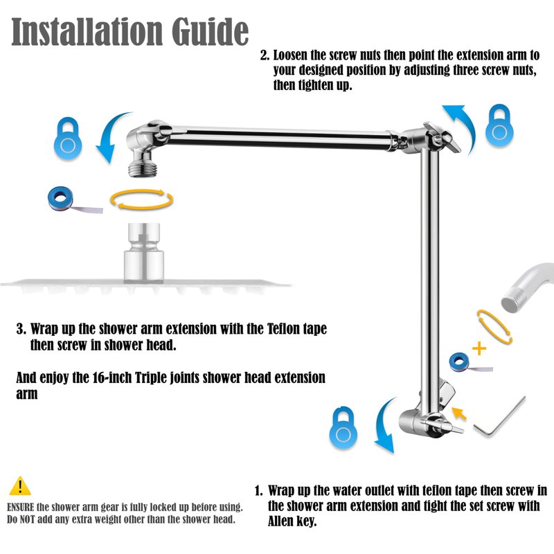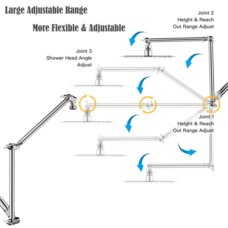 - Extra Long Reach and Height & Angle Adjustable: With an impressive 16-inch length, our shower head extension arm provides extended reach, eliminating the need for uncomfortable bending or stretching. The height and angle adjustable design ensures a personalized and relaxing shower every time.