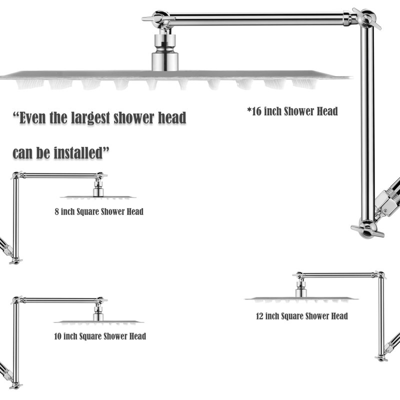 - Versatile Compatibility: Designed with a standard thread size and the ability to accommodate larger shower heads up to 20 inches in size, our extension arm seamlessly fits with most shower heads on the market, making it a versatile addition to any bathroom.