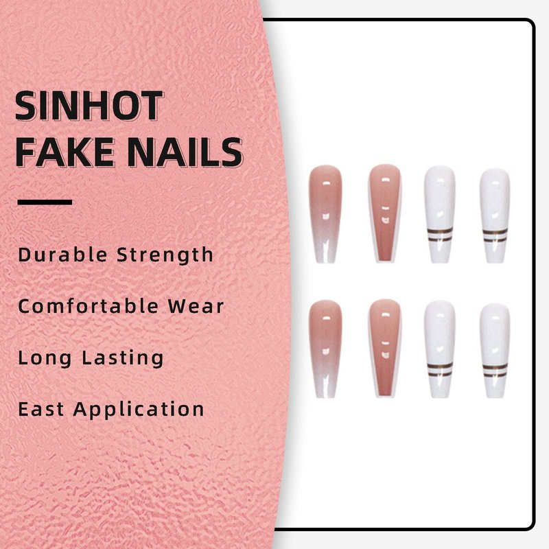 SINHOT Medium Coffin Press on Nails Ballerina Fake Nails Glossy Glue on Nails Gold Line Acrylic Nails with White Gradient False Nails Designs 24 pcs