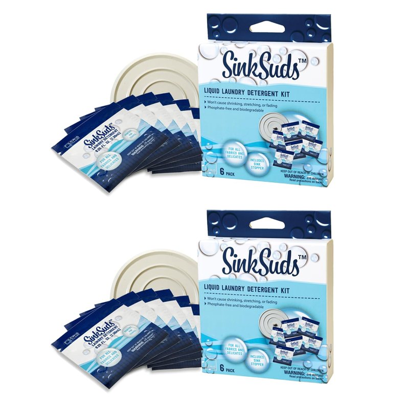 - SINKSUDS, IT’S SIMPLE: Simply mix the packet in water, wash your garments, and hang dry. Use 1 packet for 2-3 garments and 4 packets for a full load of laundry. Includes 12 unscented, 0.25 fluid ounce packets and 2 sink stoppers.