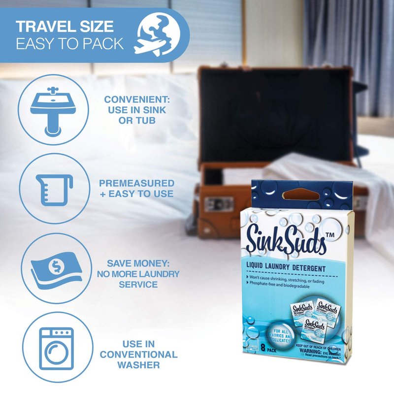 SinkSuds Laundry Detergent | Travel Size Liquid Soap | TSA Compliant | Safe For All Fabrics | 8 Packets
