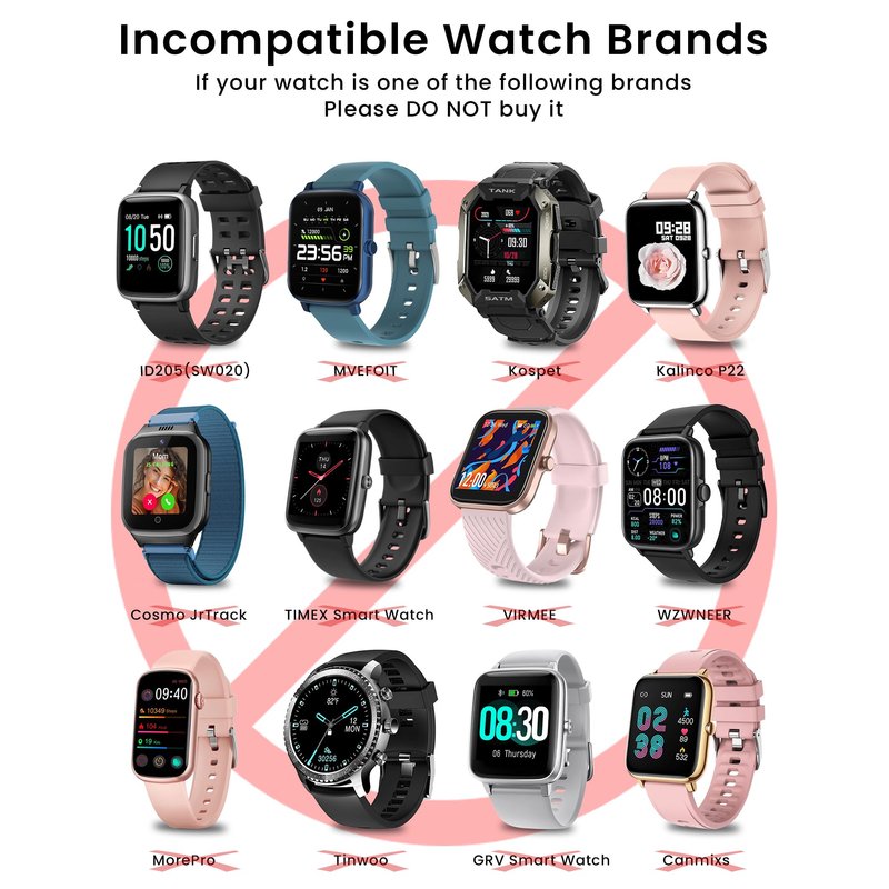 - NOT Compatible for MVEFOIT/KOSPET/Acclafit L51/KALINCO P22/C-Max/COSMO JrTrack 2 SE/TIMEX/VIRMEE/TickTalk 4/WZWNEER/MorePro/iTECH/Tinwoo/MyBat Pro Activate Fitness/GRV/CANMIXS/Xiaomi Haylou LS01、LS02、GST、LS09B/Vigorun ID216/Noise ColorFit Pro 3 Spo2、ColorFit Ultra/TOZO S2/Fitniv IW1/AOKESI 1.69"/Kummel/boAt Watch Xtend/SoundPEATS Watch1/SoundPEATS/Livikey/Boean/FVYAO/Overfly/Willful ID205、021、SW01/Letsfit IW2、ID205/YAMAY SW01、021、023/UMIDIGI Uwatch 5、Uwatch GT、Uwatch/Dirrelo ID206mini、ID207/Cubitt CT2Pro Smart watch.