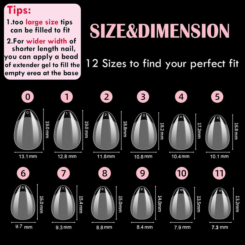 - 12 SIZES/600PCS: One box includes 50 pcs of 12 sizes, a total of 600 pieces. Range of sizes to ensure proper fit to large, normal, and small nail beds.SINOKAME is devoted to making each girl's nail look classic and beautiful by supplying the basic manicure tools