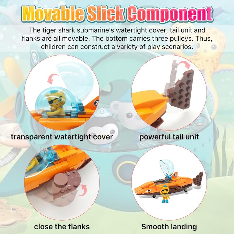 Movable Slick Component:The tiger shark submarine's watertight cover, tail unit and flanks are all movable. The bottom carries three pulleys and the mini figure and tiger shark submarine are separable. Thus, children can construct a variety of play scenarios. Whether it's an enemy attacking and defending your home, or winning a battle and landing on the ground under the sea.