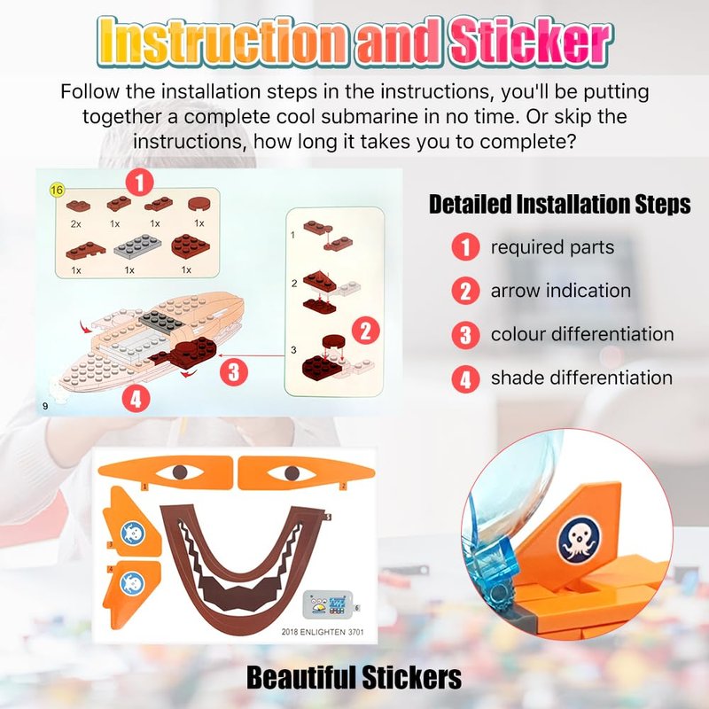 Detailed Installation Steps and Beautiful Stickers:The building block toy comes with detailed installation instructions and a nice sticker sheet. The instructions are printed in colour and each step of the process is easy to understand as the parts needed and where to install them are marked with arrows, different colors and different shades.