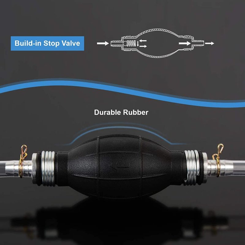 - 【High Quality】: The siphon bulb is made of rubber ,which starts siphoning liquid flow quickly;Both ends are made of heavy aluminum and clamped on with solid metal springs;2 flexible duarable PVC transparent hose (1.2m+0.8m), provides easy reach into containers, petrol,high temperature and corrosion resistant.