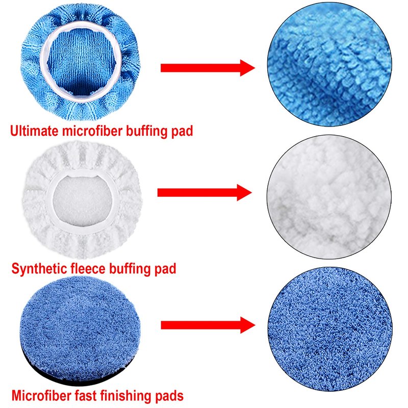 - Package include- there are 5 pieces 6 inch sponge polishing pads (wave), 1 piece woolen buffing pad, 1 piece drill adapter, 1 piece hook and loop pad, 1 piece microfiber fast finishing pad, 2 pieces microfiber car polishing bonnet and 2 pieces waxer bonnet, 13 pieces in total