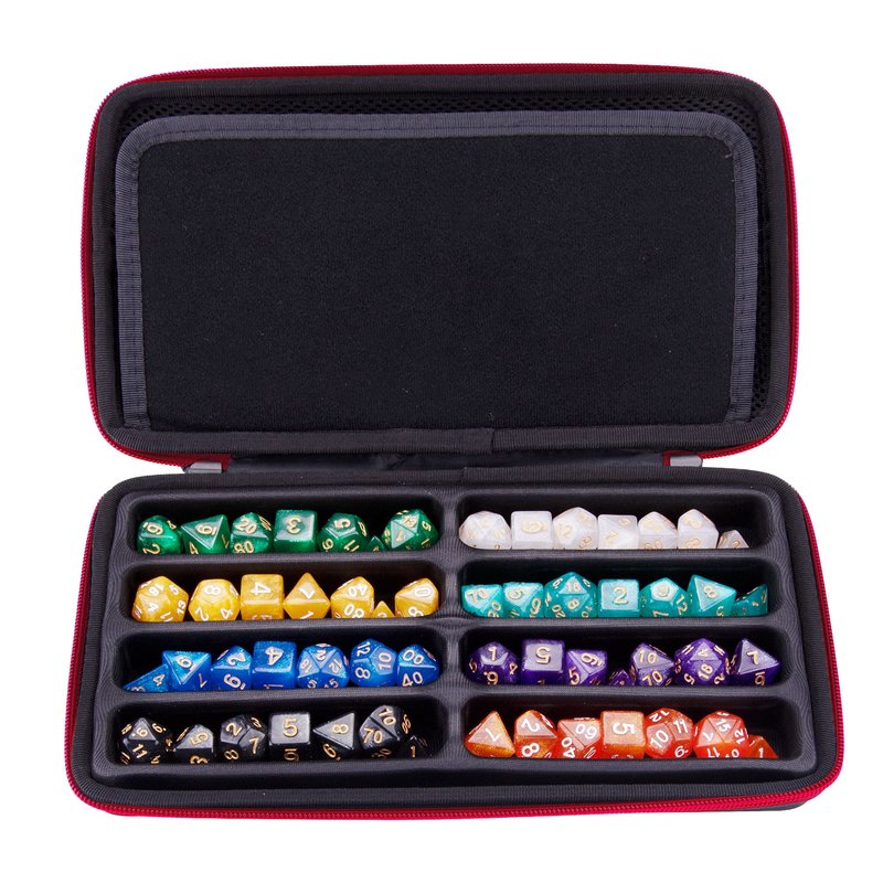 The pre-slotted EVA dice case can hold up to 8 sets DND dice, detachable design allow the empty main compartment area can be used as a dice rolling tray.