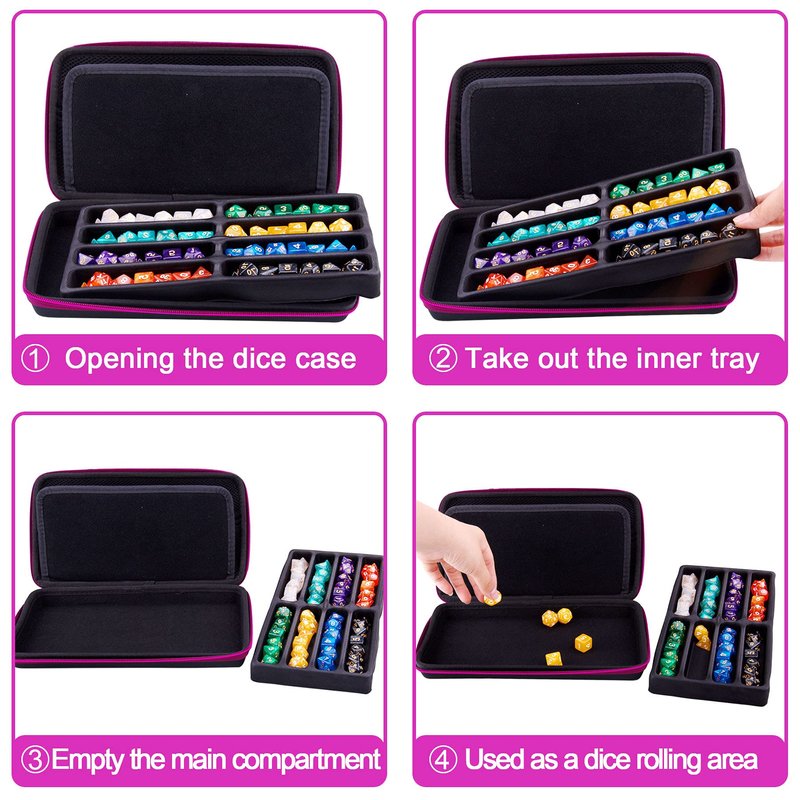 - Storage and Rolling - the pre-slotted EVA tray on the dice storage case can hold up to 8 sets DND dice, detachable design allow the empty main compartment area can be used as a dice rolling tray