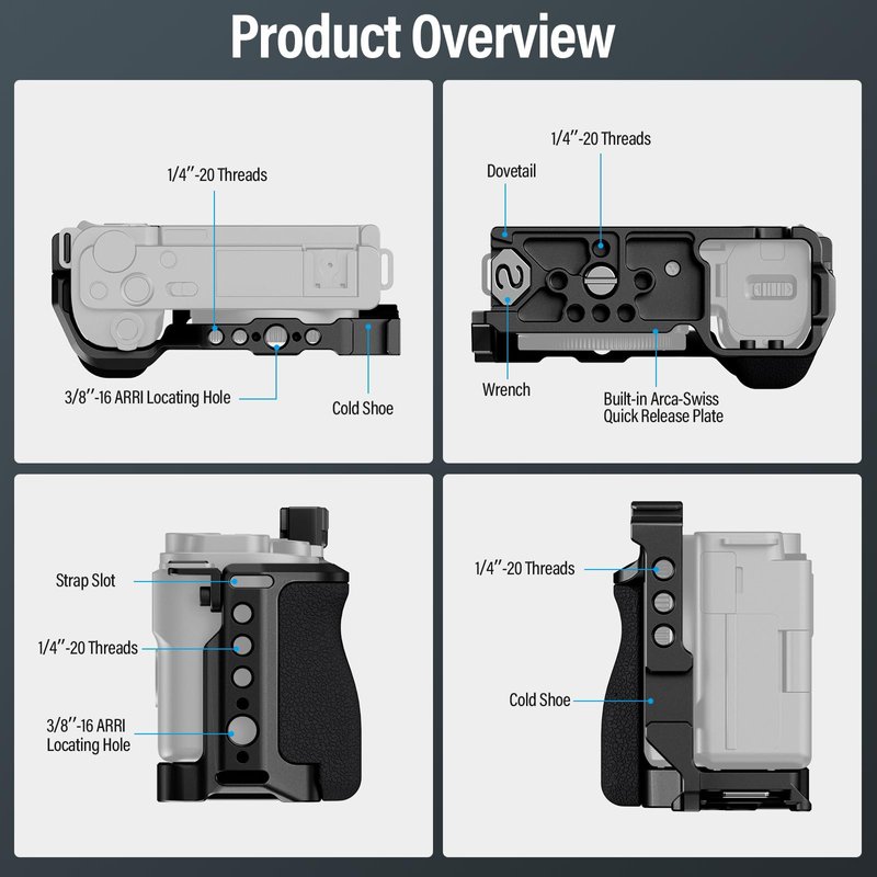 - Designed for Sony ZV-E10: The SIRUI camera cage features an detachable silicone handle designed with ergonomic precision, ensuring a comfortable grip. The bottom of the cage is securely with a 1/4"-20 screw, while the added anti-twist lock on the side provides dual reinforcement for your camera, effectively preventing any unwanted rotation.