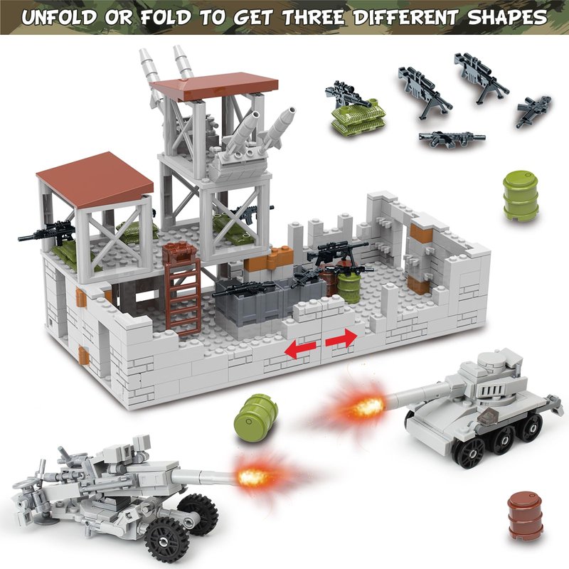 - Three Military Base Shapes- This set of military base building blocks can be built according to the instructions to create three either closed or open shapes to simulate different scenarios, perfect for military-loving kids 6+ years