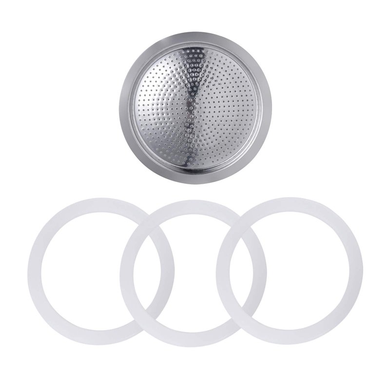 - Suit: 6 Cup Stainless Steel Espresso Coffee Maker Replacement Parts Moka Pot 1 Filter 3 Silicone Gasket Seals Please Note Size