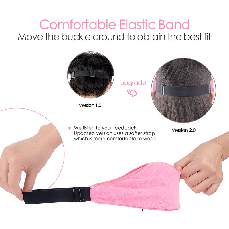 Elasticated strap band is very thin with a buckle type fastening. Easy to adjust headband won't tangle hair or snag pillow. And the plastic adjuster stays at the back of your head, not at your temples. Velcro straps do not always work. Also, overtime, velcro deteriorates, often due to fluff sticking in the 'hooky' side or softening of the plastic.