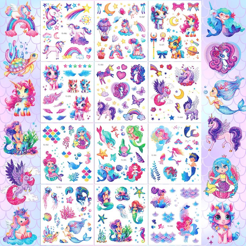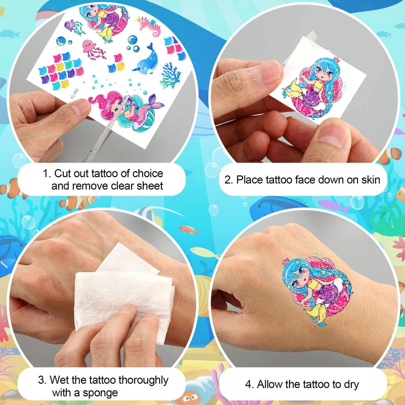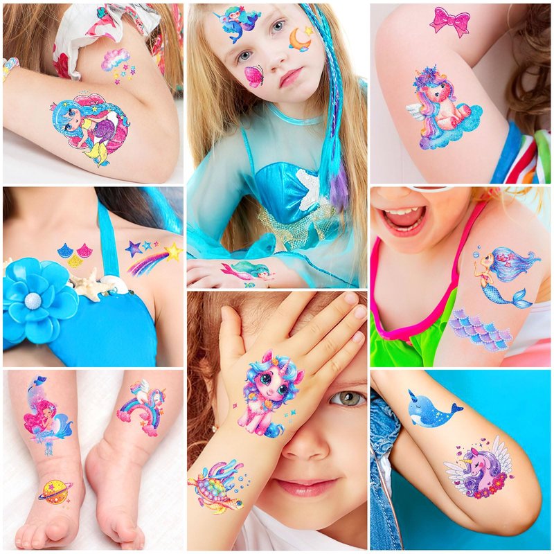 - Assorted Temporary Tattoos Body Art Designs: Custom butterfly tattoos temporary stickers contains various unicorn mermaid patterns, red hair mermaid, splash glitter diamond, jellyfish, starfish, seaweed, shell, pearl, tortoise, sea horse, conch, undersea animals, stars and unicorn, hearts, rainbow, clouds, hot air balloon, ice cream, angel wings, butterfly, pony tail, moon and magic stick, all girls favors designs
