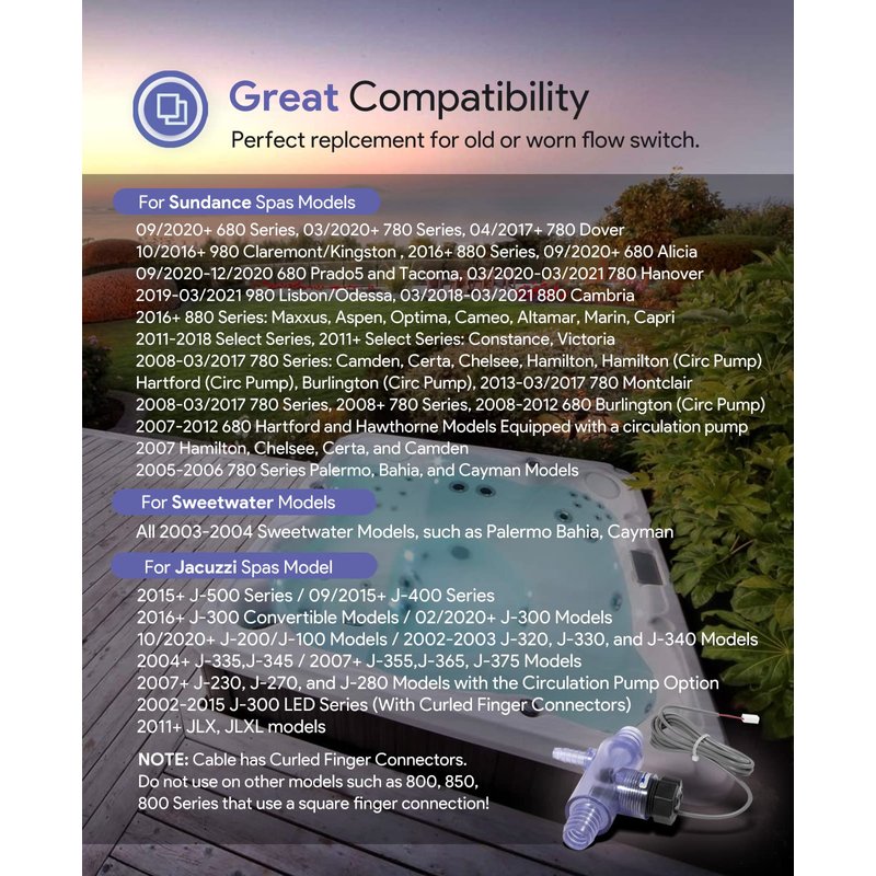 - 【For Jacuzzi & Sweetwater Models】 For Jacuzzi 2015+ J-500 Series / 09/2015+ J-400 Series / 2016+ J-300 Convertible / 02/2020+ J-300 Models / 10/2020+ J-200/J-100 / 2002-2003 J-320, J-330, and J-340 / 2004+ J-335,J-345 / 2007+ J-355,J-365, J-375 / 2007+ J-230, J-270, and J-280 with Circulation Pump Option / 2002-2015 J-300 LED Series (With Curled Finger Connectors) / 2011+ JLX, JLXL; For Sweetwater 2003-2004 Sweetwater Models: Palermo Bahia, Cayman All 2003-2004 Sweetwater Models