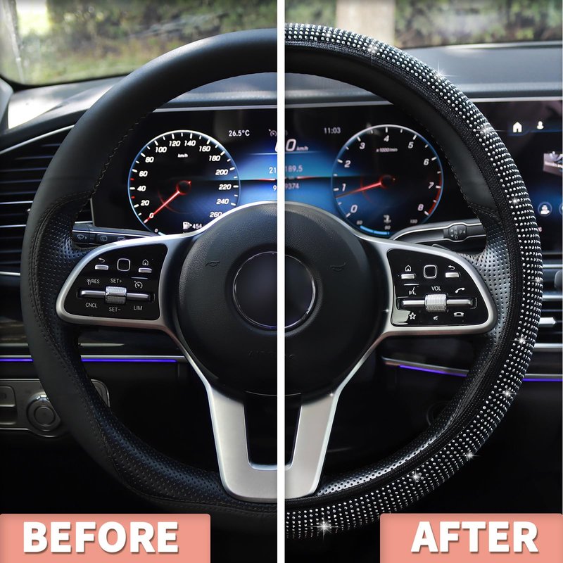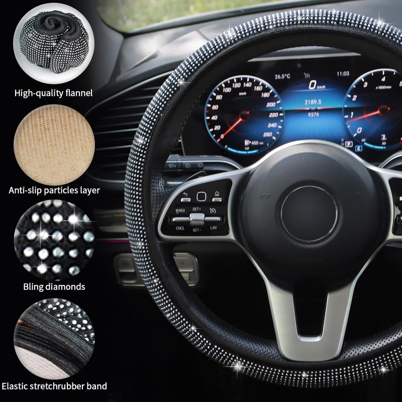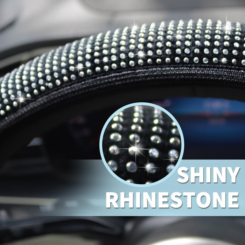 - Unique Design: Sparkling rhinestone steering wheel cover, decorated with hundreds of sparkling rhinestones. Sparkling in the sun, beautiful and dazzling. Each side of the rhinestone is finely cut to refract color in different light.