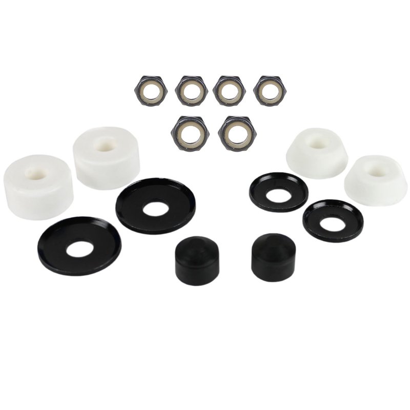 Trucks thrashed? We thought so... you skate. Luckily, as long as you have some aluminum to grind on you can keep those puppies going for years with a little TLC, or a little bushing rebuild kit. This kit includes cup washers, bushings, pivot cups, axle nuts, and kingpin nuts. Medium 95A.