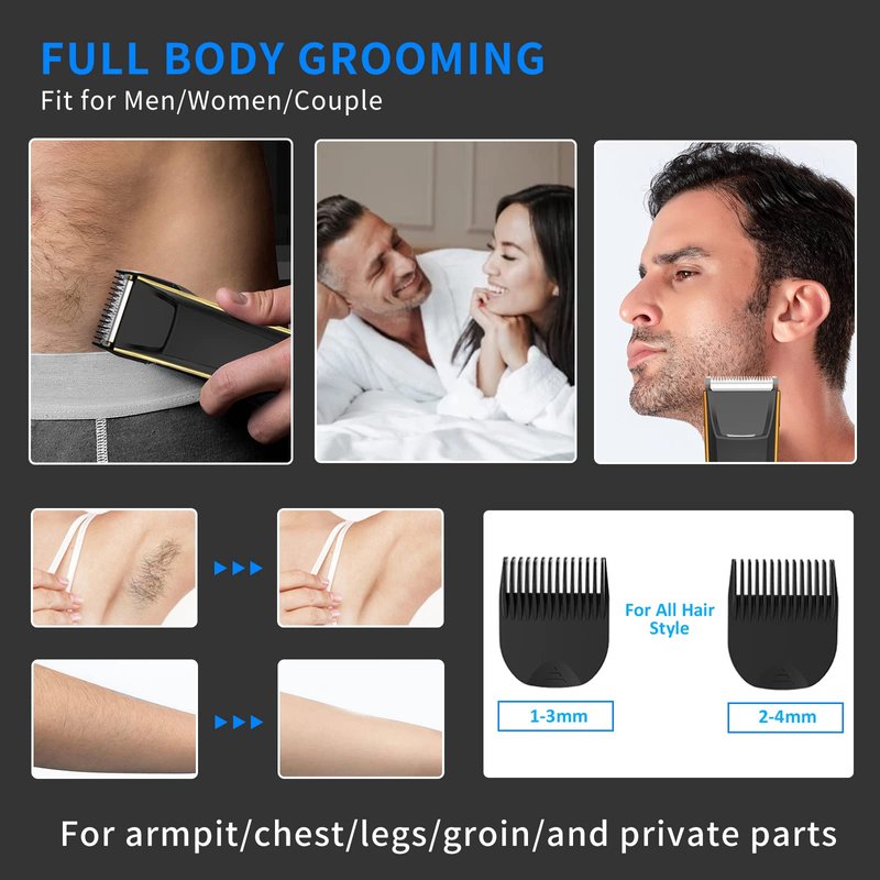 - [2 Adjustable Guards Combs(1-3 / 2-4 mm )] This body trimmer is suitable for various lengths of hair. And fit for sensitive areas, making it perfect for both men and women. Whether you need to trim face, chest hair, armpits, arms, thighs, groins, or private parts, our unique body trimmer groomer has got you covered.