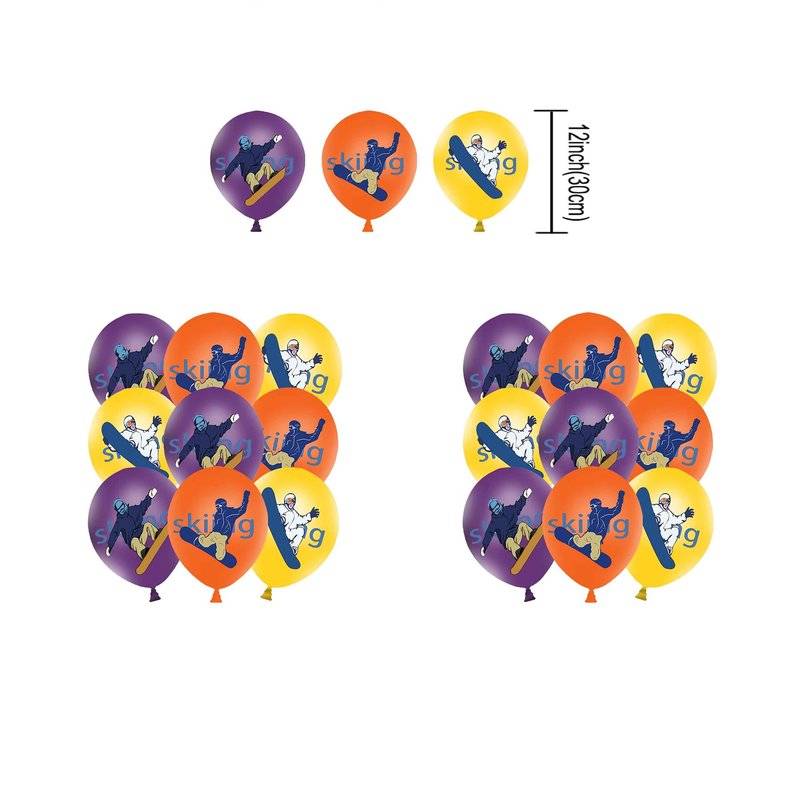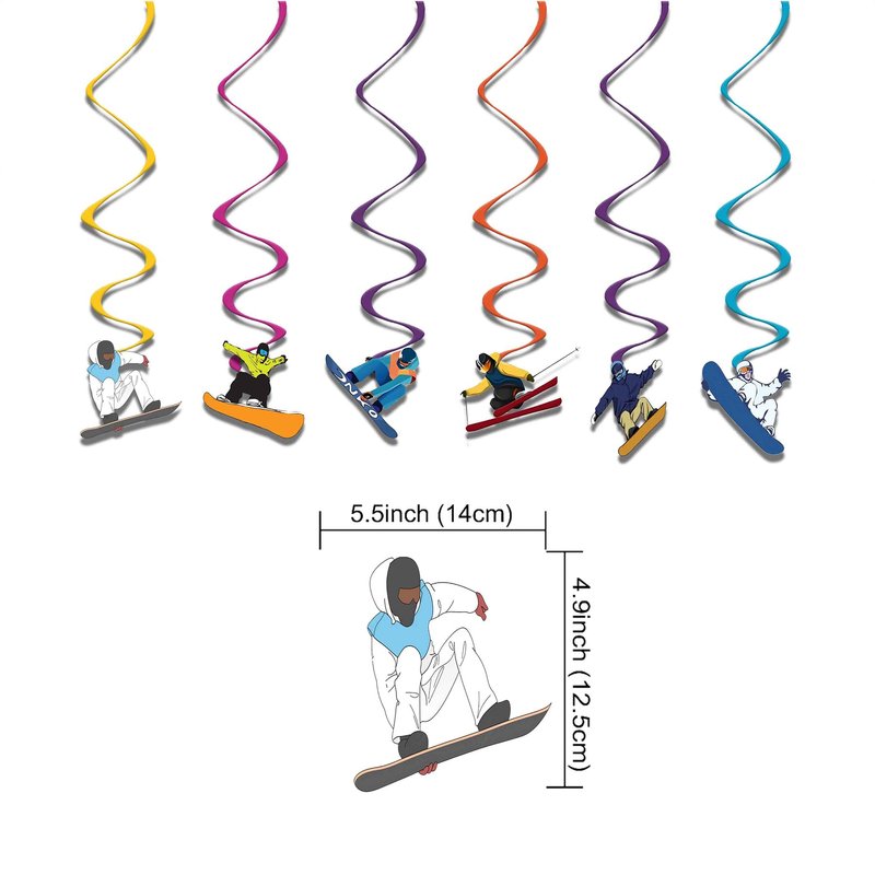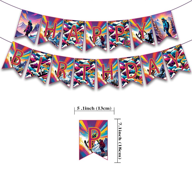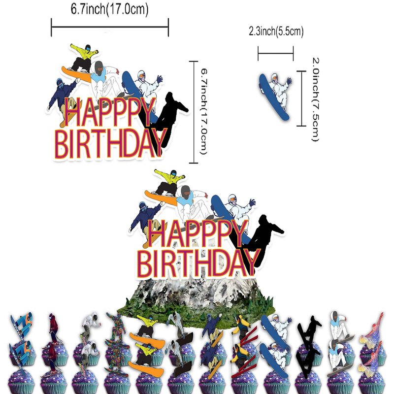 - Skiing Birthday Party Supplies Set Package includes: You will get 1 * HAPPY BIRTHDAY banner, 18 * balloon (3 styles of 6 each), 1 * cake topper, 24 * cupcake topper, 6 * hanging swirls each accessory has skiing elements, these party decorations will bring more fun to your party