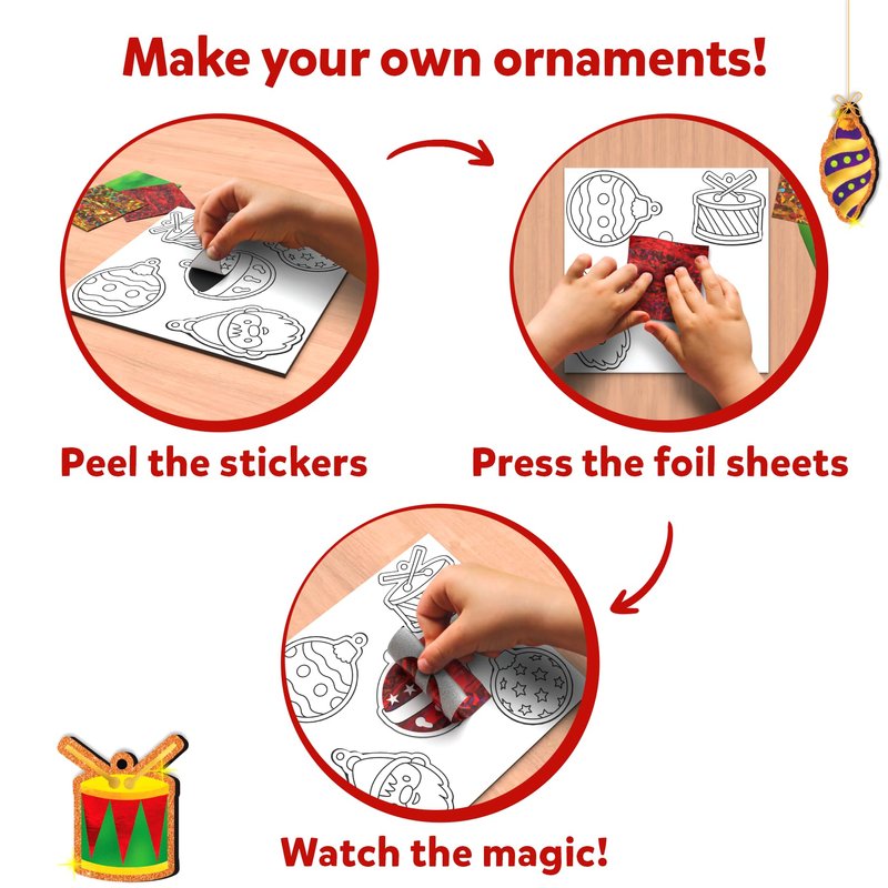 - EASY TO USE: Select ornaments of your choice, then press sparkly foil sheets on top, peel it away and experience the magic! Flip the ornament and repeat on the other side. Then, use the poke-in stick to pop out the circle, thread a string through, and tie a knot. Just like that, your ornament is ready to dazzle on your Christmas tree!