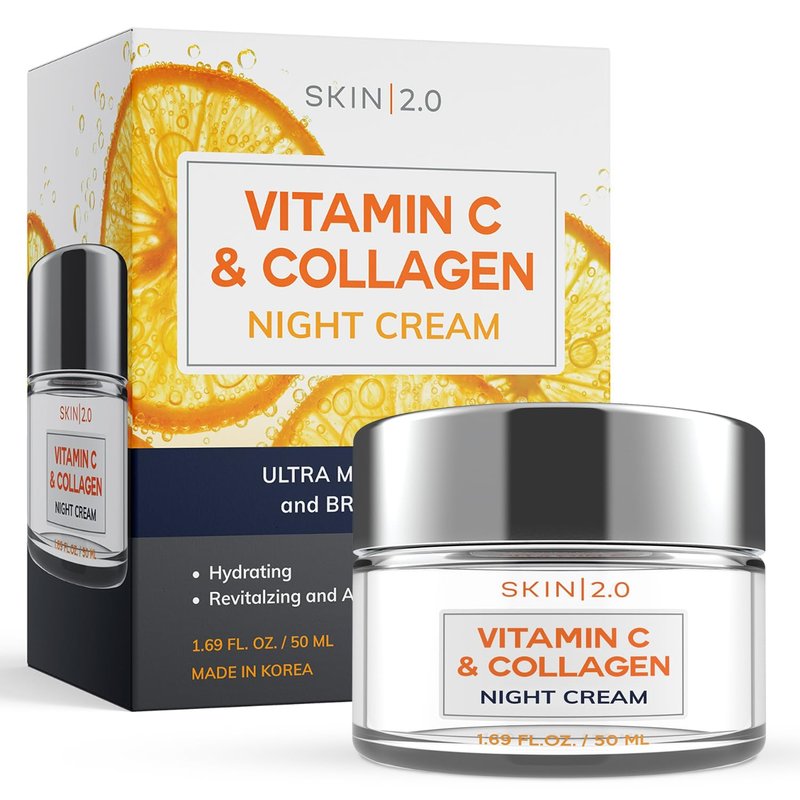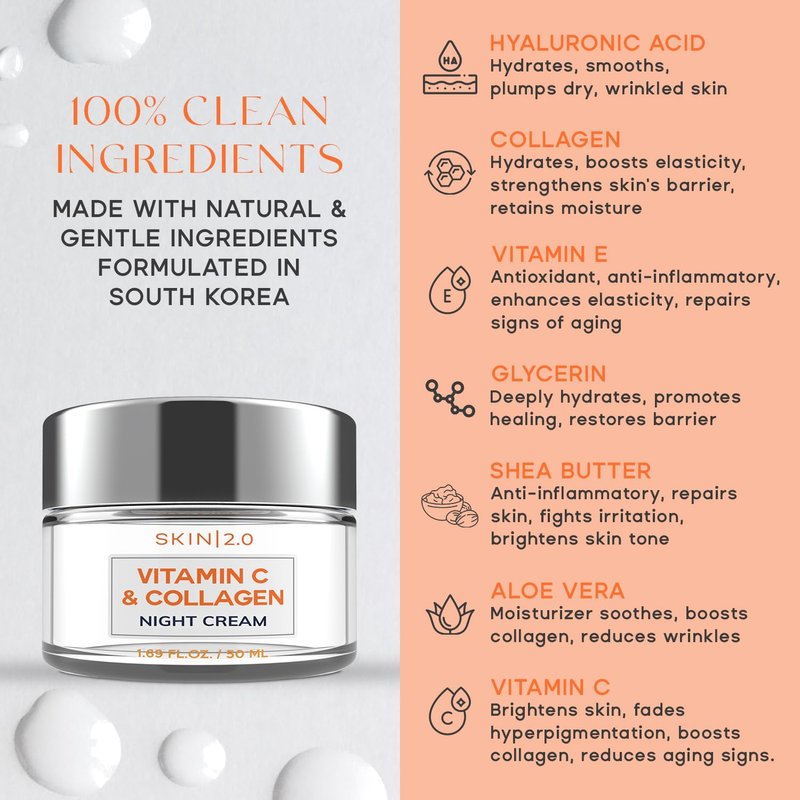 Skin 2.0 Vitamin C and Collagen Face Moisturizer - Anti-Aging, Skin Tightening, Brightening Night Cream - Cruelty Free Korean Skin Care For All Skin Types - 1.69 Fl. oz