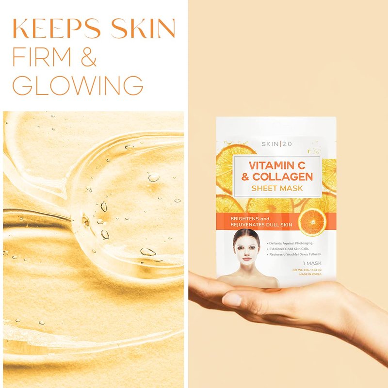 - BRIGHTENING & REVITALIZING: Our Facial Sheet Mask with Vitamin C and Collagen helps brighten and rejuvenate your skin, leaving it with a radiant, youthful glow. Experience a refreshed and revitalized complexion.