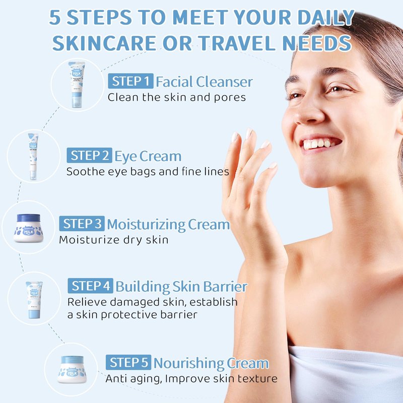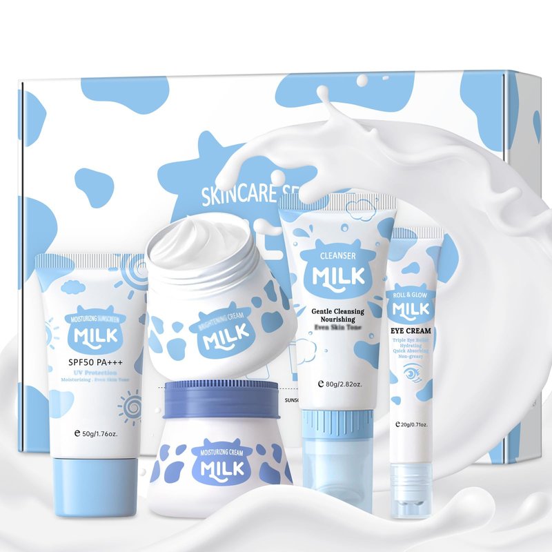 - DAILY FACIAL CARE ROUTINE KIT: Milk face care kit is designed for girls. The facial kit contains facial cleanser, eye cream, face cream and other products, fully meeting the daily skin care needs or before makeup. Repair and nourish skin, keeping smooth