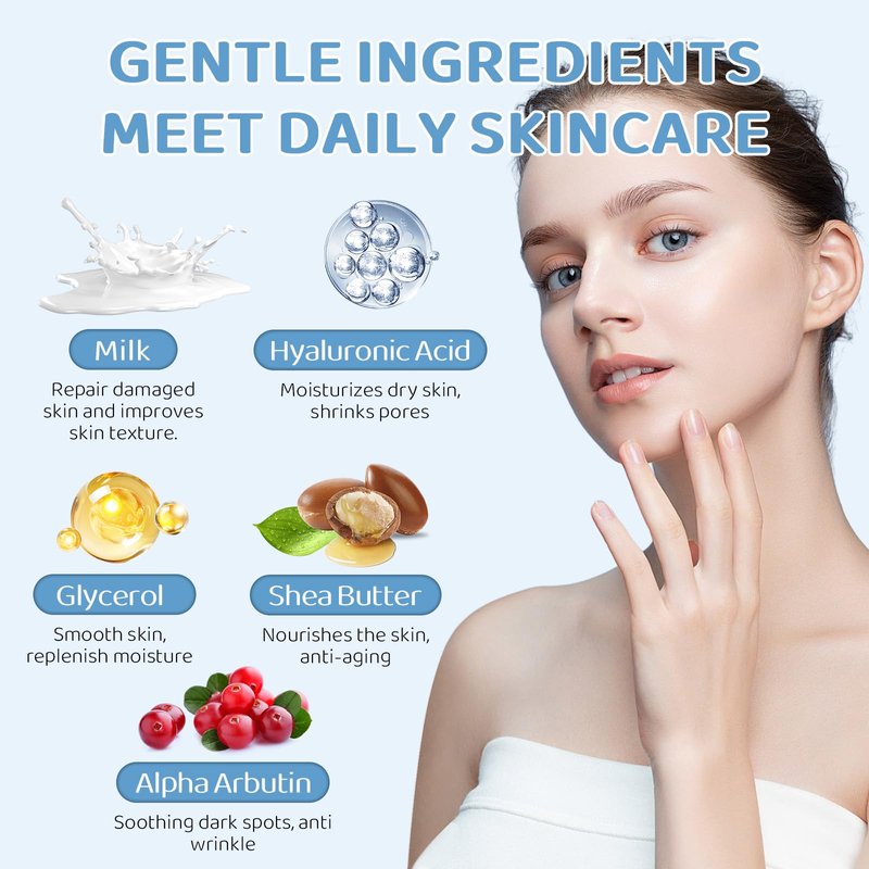 - ANTI AGING FACE CARE SET: Skincare kit contains rich milk, hyaluronic acid, arbutin and shea butter, which provide the skin with sufficient nutrition and moisture, reduce acne, wrinkles and fine lines, shrink pores, build a skin barrier, delay skin aging