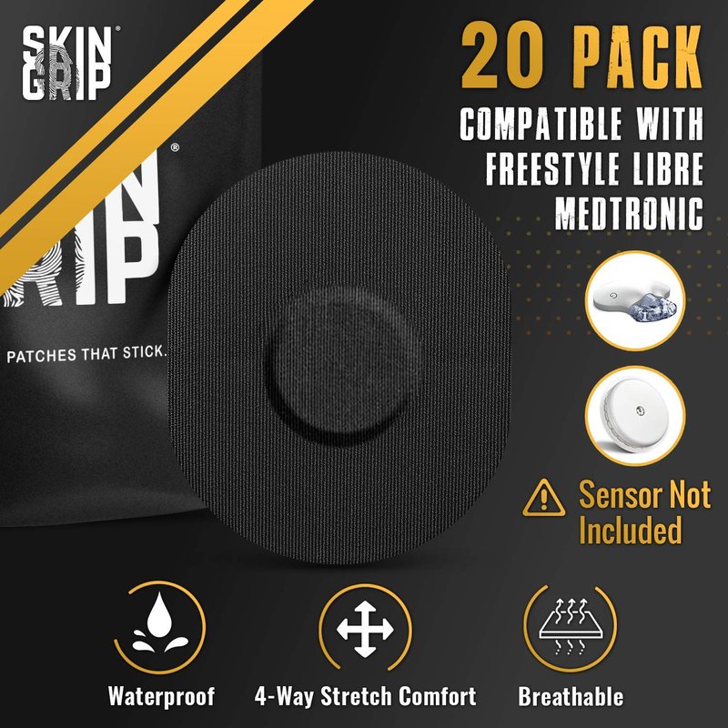 Skin Grip CGM Patches for Medtronic Guardian Sensor (20-Pack), Waterproof & Sweatproof for 10-14 Days, Pre-Cut Adhesive Tape, Continuous Glucose Monitor Protection(Black)