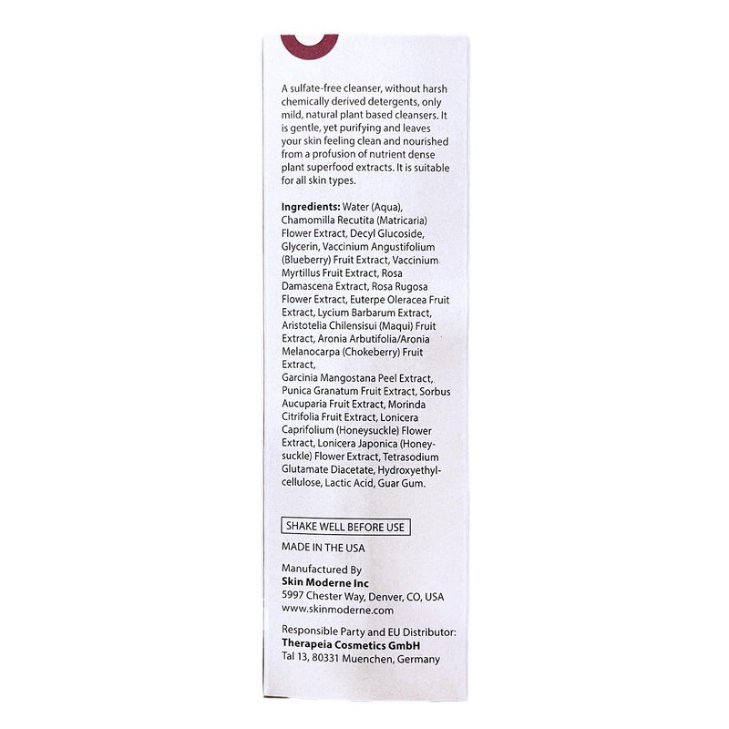 - Organic Superfood Extracts. This cleanser is rich in phytonutrients, blueberry, bilberry, aronia, pomegranate, acai, mangosteen, noni, goji, and maqui extracts, which nourish and protect skin cells from free radicals and oxidation. Natural Glycerin boosts moisture retention in the skin, keeping skin hydrated.