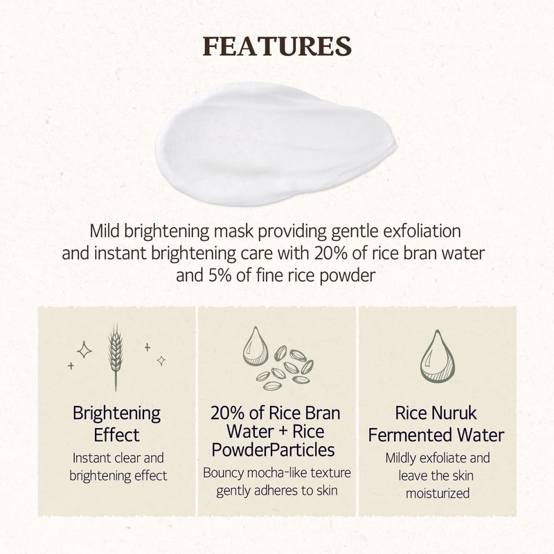 - Instant Clear & Radiance Effect - 20% Cheorwon Odae rice bran water helps clearing the skin tone and clarifying dead skin immediately after application and 5% Cheorwon Odae rice powder provides gentle exfoliation by fine rice powder particles.
