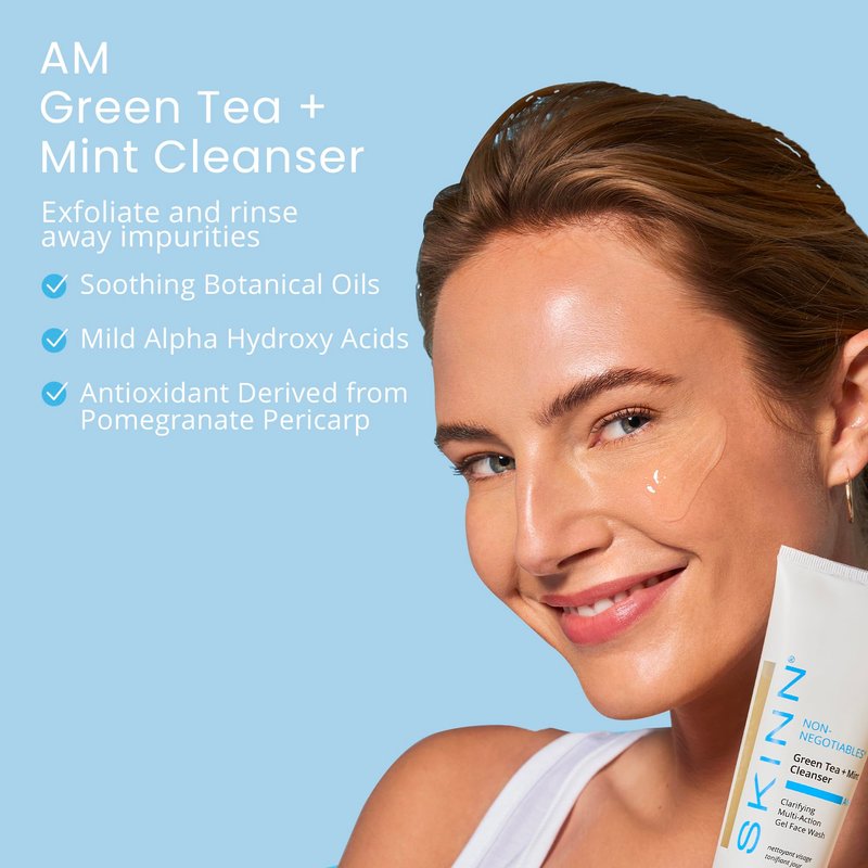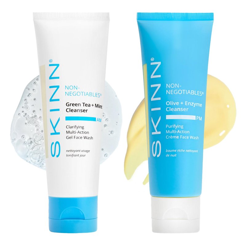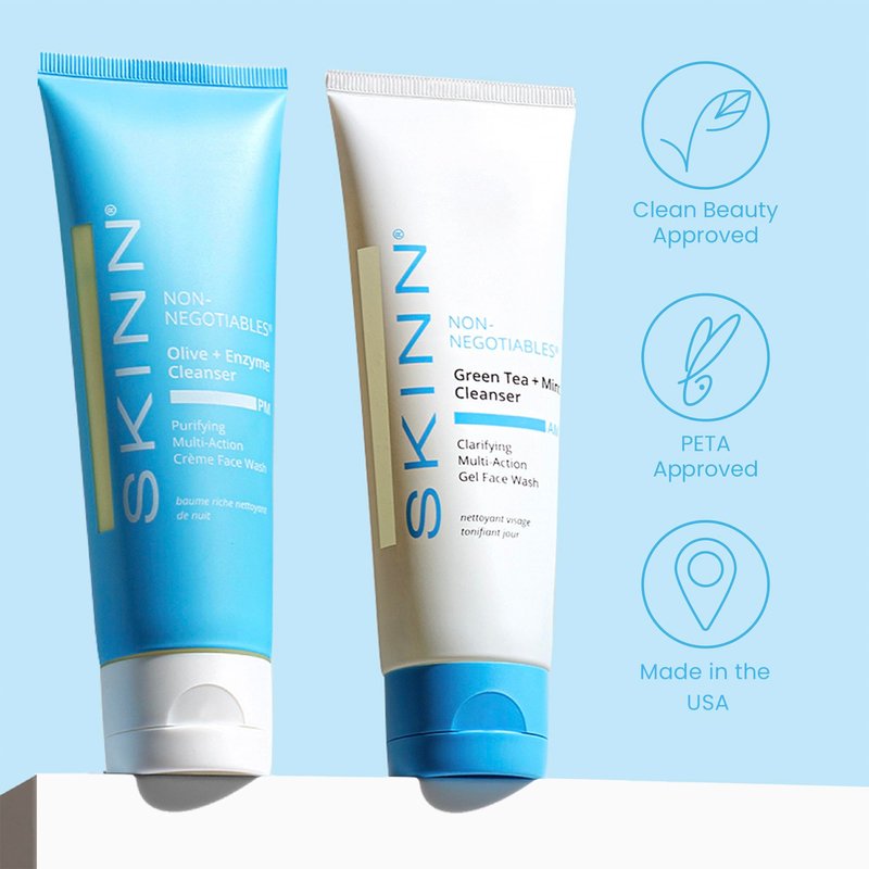 - AM + PM Facial Cleanser: This SKINN Green Tea + Mint Cleanser and Olive + Enzyme Cleanser Duo is a refreshing morning and soothing night time treatment that will leave your skin feeling clean around the clock. Includes (1) 4.0oz tube of Olive + Enzyme Cleanser and (1) 4.0oz tube of Green Tea + Mint Cleanser.