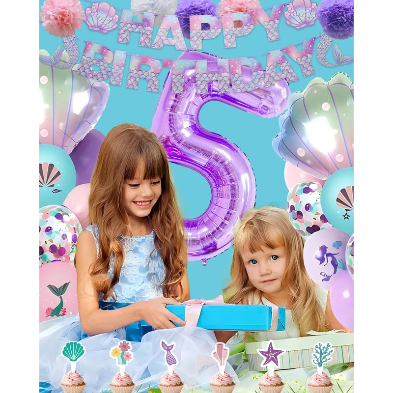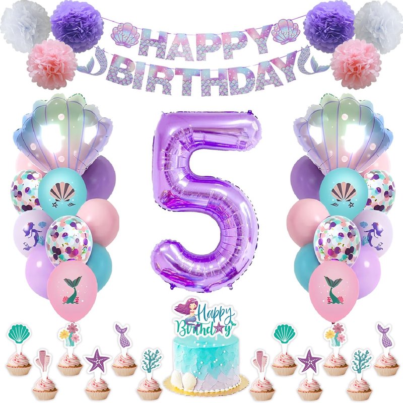- [Mermaid Birthday Decorations Include]:The mermaid birthday decorations includes 1pack mermaid theme purple “happy birthday” banner,6pcs pink/purple/white pom poms Flowers,2pcs shell foil balloons,1pc number 5 foil balloons,20pcs(6 Purple ,6pink,4 Confetti, 4 Blue) latex balloons,1pc cake topper, 12pcs cupcakes toppers.This is a complete and rich mermaid-themed decoration, which will help your little girls have an unforgettable birthday