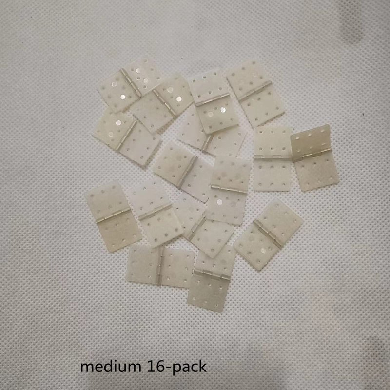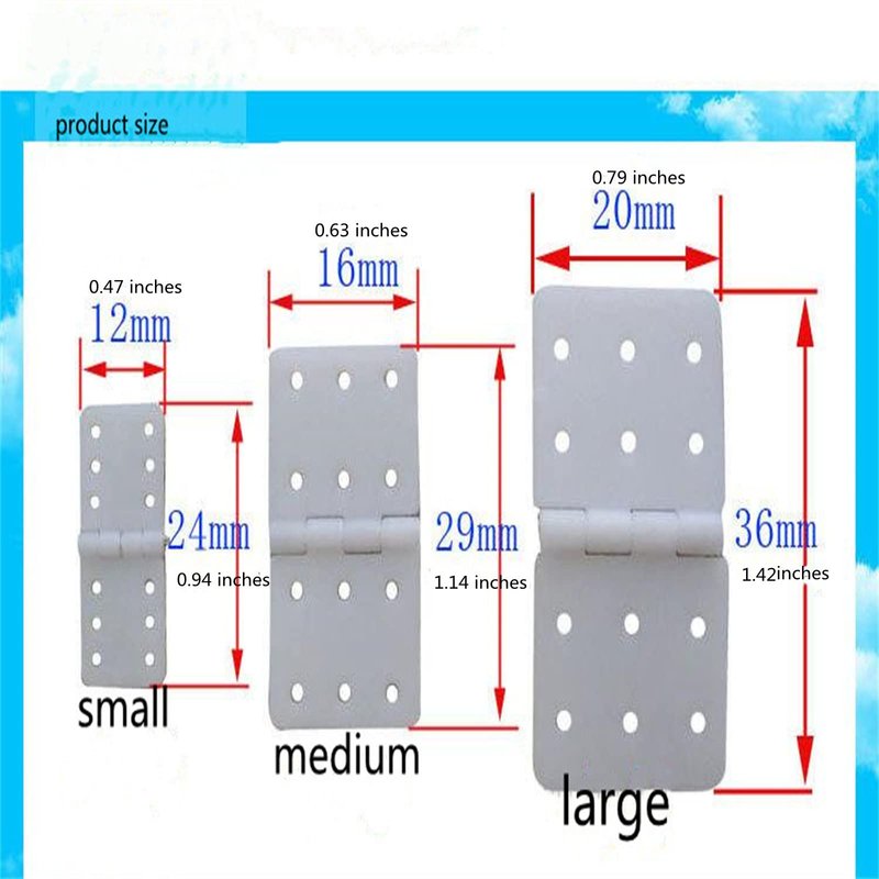 - 16 Pack Fixed Nylon Hinges Large W12×L24mm=0.47×0.94 inches Medium W16×L29mm=0.63×1.14 inches Small W20×L36mm=0.79×1.42 inches These mini nylon hinges please see the size and use
