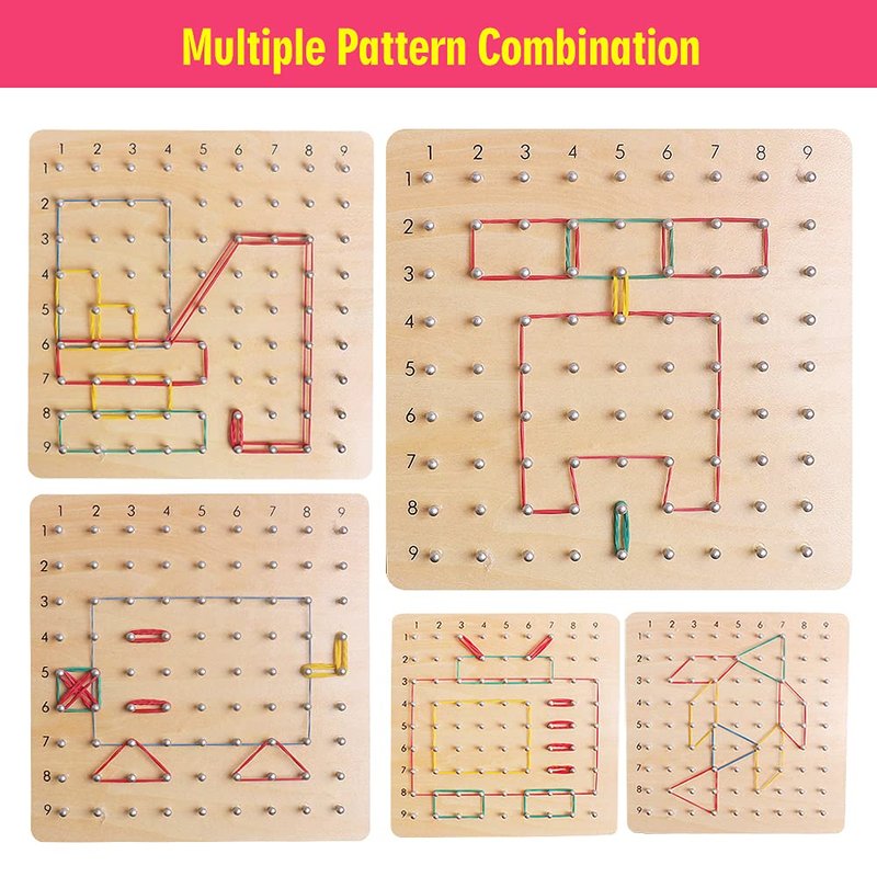 - Funny and Imaginative Graphical Educational Toys: Begins by manipulating the rubber bands stay on pegs. The geoboard back side has pegs in the shape of a circle, the little tops on them and nails on the long side help make it easy for small fingers to get the bands on them and stay on them. It’s great for learning math and literacy skills by identifying geometry shapes.
